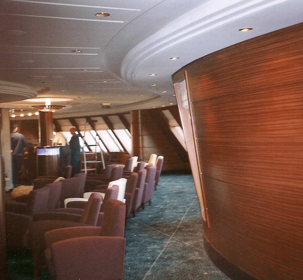 Quand j’arrive dans le local où je dois intervenir, j’ouvre mon coffre, je sors mes affaires et je m’installe dans mon boulot. Le registre de mes activités en peinture-déco sur les paquebots comprend tout ce qui est faux-bois, faux-marbre, dorure à la feuille, frises et peintures décoratives sur corniches, portes, cloisons et divers volumes. Dans un chantier naval, le recours aux illusions de matière a notamment pour intérêt de permettre des gains de poids. Comme sur les épontilles en métal ou sur les colonnes et les pilastres en staff où je vais réaliser, par exemple, du faux marbre en peinture. De même, pour des raisons de poids et de résistance au feu, le constructeur limite l’emploi du bois massif pour utiliser plutôt du contre-plaqué, des stratifiés avec parements en bois divers, ou… du décor peint. L’illusion de matière permet aussi de contourner des contraintes physiques. Lorsque les lignes de la coque, à l’arrière et à l’avant du bateau, imposent des courbures que les stratifiés ne supportent pas, les plaquistes réalisent des panneaux incurvés par bandes. Sur le Queen Mary II, il y avait, par exemple un salon-bar dont les baies vitrées donnaient sur la proue. Les cloisons dans lesquelles ces ouvertures étaient encastrées présentaient une double courbure, verticale et horizontale. Comme tout le reste du décor était en stratifié d’acajou, il a fallu que, par la peinture, je donne l’illusion que la partie courbe était, elle aussi, réalisée en acajou. Objectif atteint puisque les gens se sont demandés comment les menuisiers avaient réussi l’exploit de courber ces panneaux de bois dans les deux sens. Petite satisfaction personnelle…