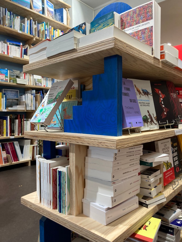 « L’Embarcadère » : c’est ainsi que nous avons baptisé la librairie, Sarah, moi et l’association « Des Voix au chapitre » quand nous l’avons créée il y a huit ans. Notre logo associe un petit bateau en papier et un livre. C’était une manière de nous ancrer dans le territoire en référence à son passé, à la construction des bateaux, au port d’où ils partaient : c’est tout un imaginaire. Quand nous avons réaménagé la librairie, les architectes du collectif « Fichtre ! » ont choisi de faire un clin d’œil à Saint-Nazaire, ville reconstruite. Pour le premier meuble qu’ils nous ont fabriqué, ils se sont inspirés des architectures de la reconstruction d’après-guerre, comme celle de Le Corbusier. Ils ont donc dessiné de grands plateaux et des poteaux, avant d’y mettre les murs et les escaliers. Les intercalaires qui soutiennent les livres ont tous une découpe un peu fantaisiste. Ils ont créé une espèce d’atlas de formes géométriques que l’on trouve dans l’urbanisme de Saint-Nazaire. Quand c’était vide, cela ressemblait à une maison de poupée, on avait envie d’y mettre de petits personnages. Cela ne saute pas aux yeux depuis que nous les avons remplis avec les livres, mais c’est notre particularité.