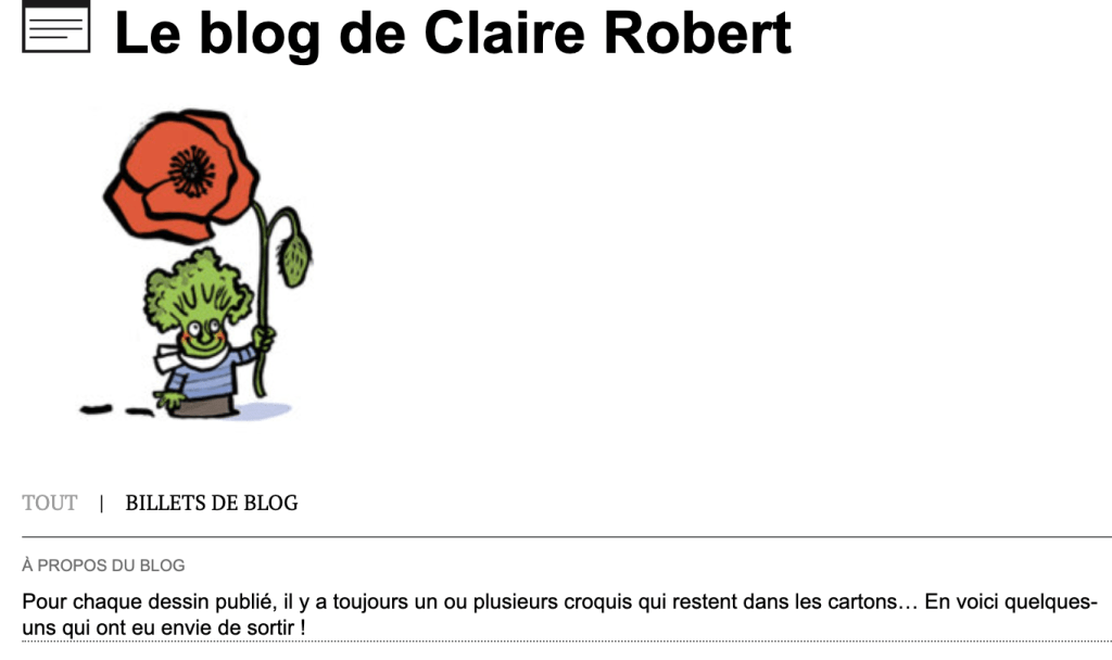 Pour suivre l’actualité avec les dessins que Claire publie sur son blog, c’est ici, sur Médiapart . Voir aussi son portfolio sur son site internet pour découvrir tout l’éventail de ses activité de graphiste et dessinatrice de presse