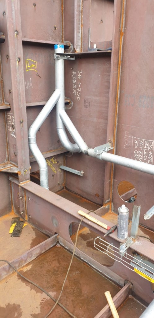 Le chantier ressemble à une sorte de Lego géant où l’on assemble des blocs qui sont des morceaux de paquebot. Les panneaux qui vont faire les blocs sont très grands et il faut y souder les tuyaux dans les trous prévus. Je soude les tubes et quand j’ai fini mon travail, la grue se saisit du bloc entier et le pose sur le bateau Et ainsi de suite. Après, quand les panneaux sont installés, je monte raccorder leurs tuyaux.
