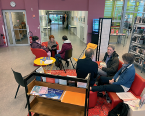 À la « bibliothèque vivante » organisée dans la Médiathèque de Saint-Nazaire, les usagers sont invités à rencontrer une quinzaine de celles et ceux dont la parole a été transcrite et transformée en récit de travail. Durant toute la journée, les usagers défilent pour un quart d’heure, interrogent, se confient parfois. Et le murmure des conversations enfle progressivement, comme si l’intensité du récit autorisait la passion de l’échange, l’attention réciproque. Chassé-croisé de questions-réponses, de regards échangés, d’émotions discrètes. Le récit de travail parle.