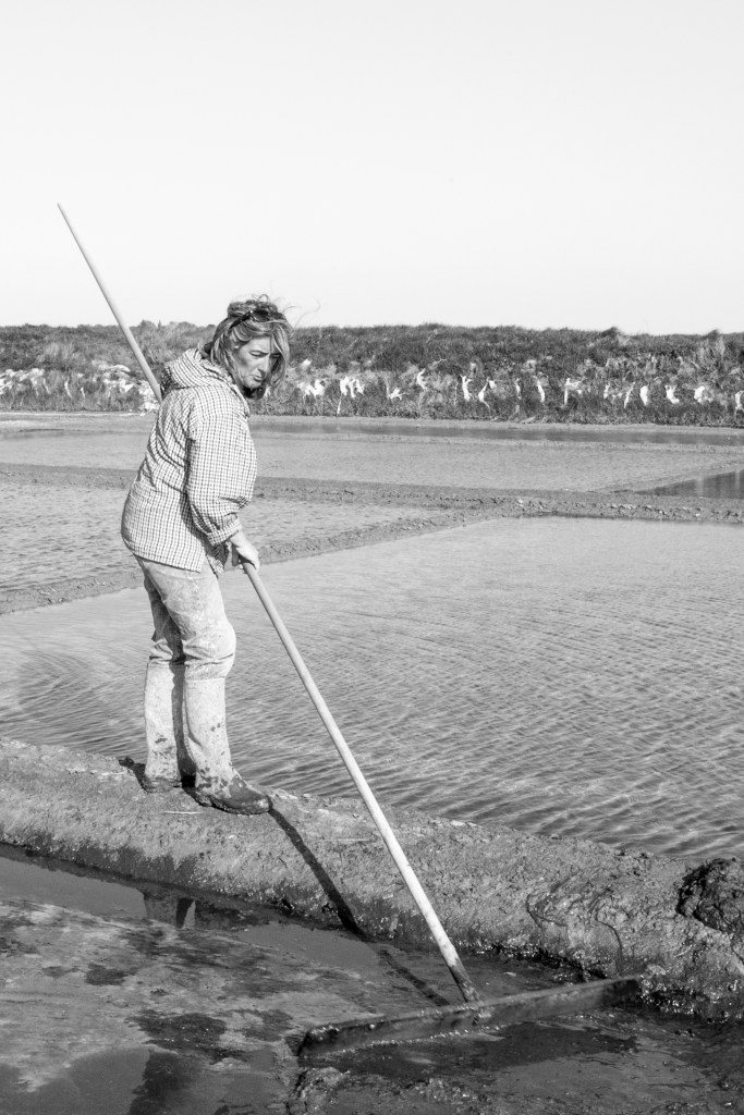 Au bout de la cinquième saison, en 2014, j’ai pris la décision de m’installer dans le coin à l’année et de découvrir ce qu’était le vrai métier de paludier. L’été, c’est la récolte, on est pieds-nus sur les ponts2, c’est beau. L’hiver ce n’est pas la même chose. On est tout seul avec ses bottes et son bonnet dans le froid, la pluie. Pour être paludier, il faut aimer travailler seul face aux éléments. J’ai donc passé un hiver à découvrir ce qu’était ce métier hors de l’été. Ça m’a plu. Faire un boulot physique en extérieur, être maîtresse de mes décisions… Ça collait avec mon caractère. J’ai donc fait une demande de formation3.